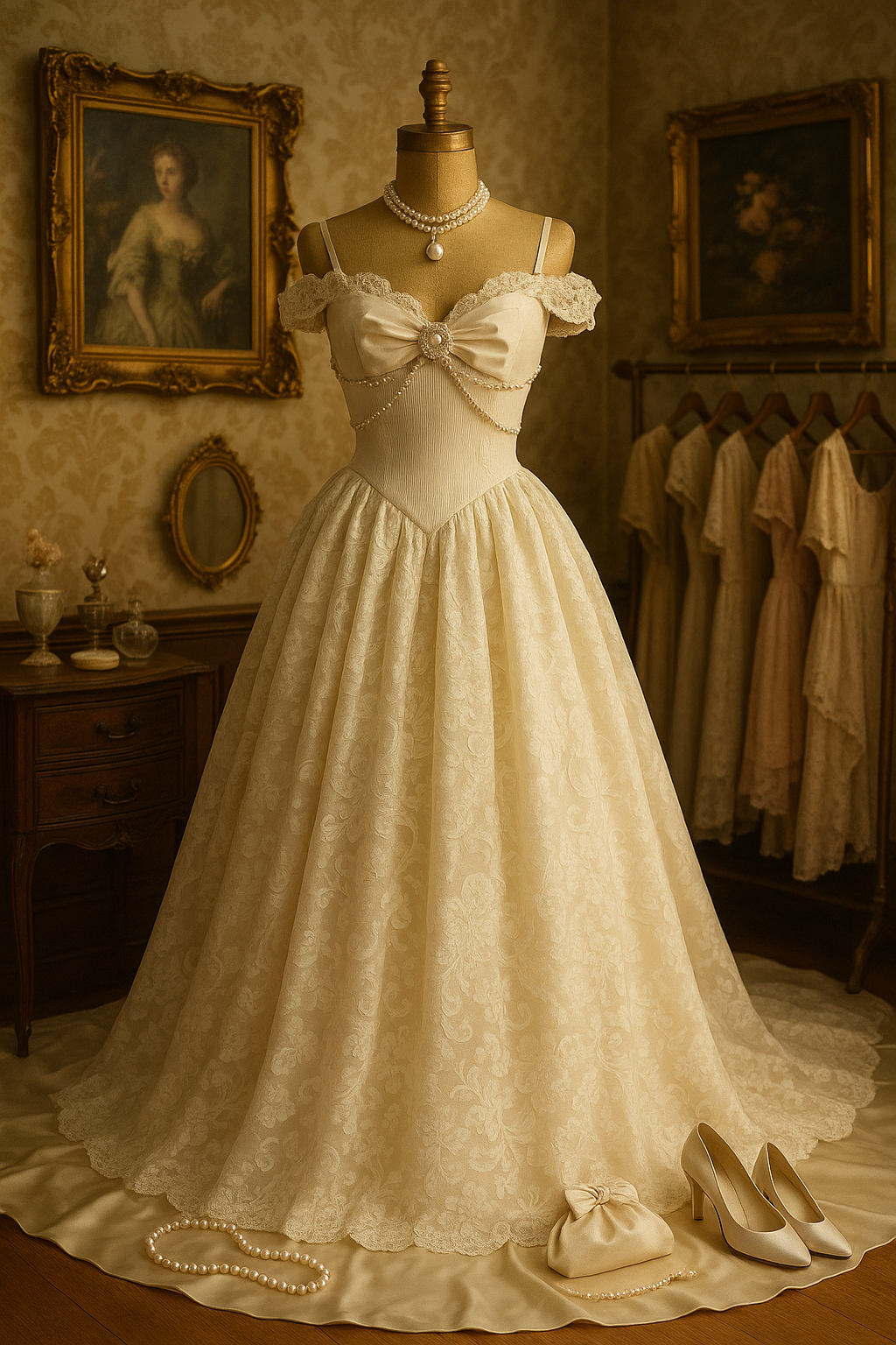Vintage bir prensesin zarafetinden ilham alan “Reine de Perle”, fildişi tonlarında hazırlanmış, inciler ve zarif dantel dokularla bezeli göz alıcı bir elbisedir. Üst kısmında yer alan el yapımı fiyonk broş, inci şerit detayları ve saten dokusu ile romantik bir silueti vurgular. Etek bölümündeki floral dantel tül ise adeta rüya gibi bir hacimle tamamlanmıştır.