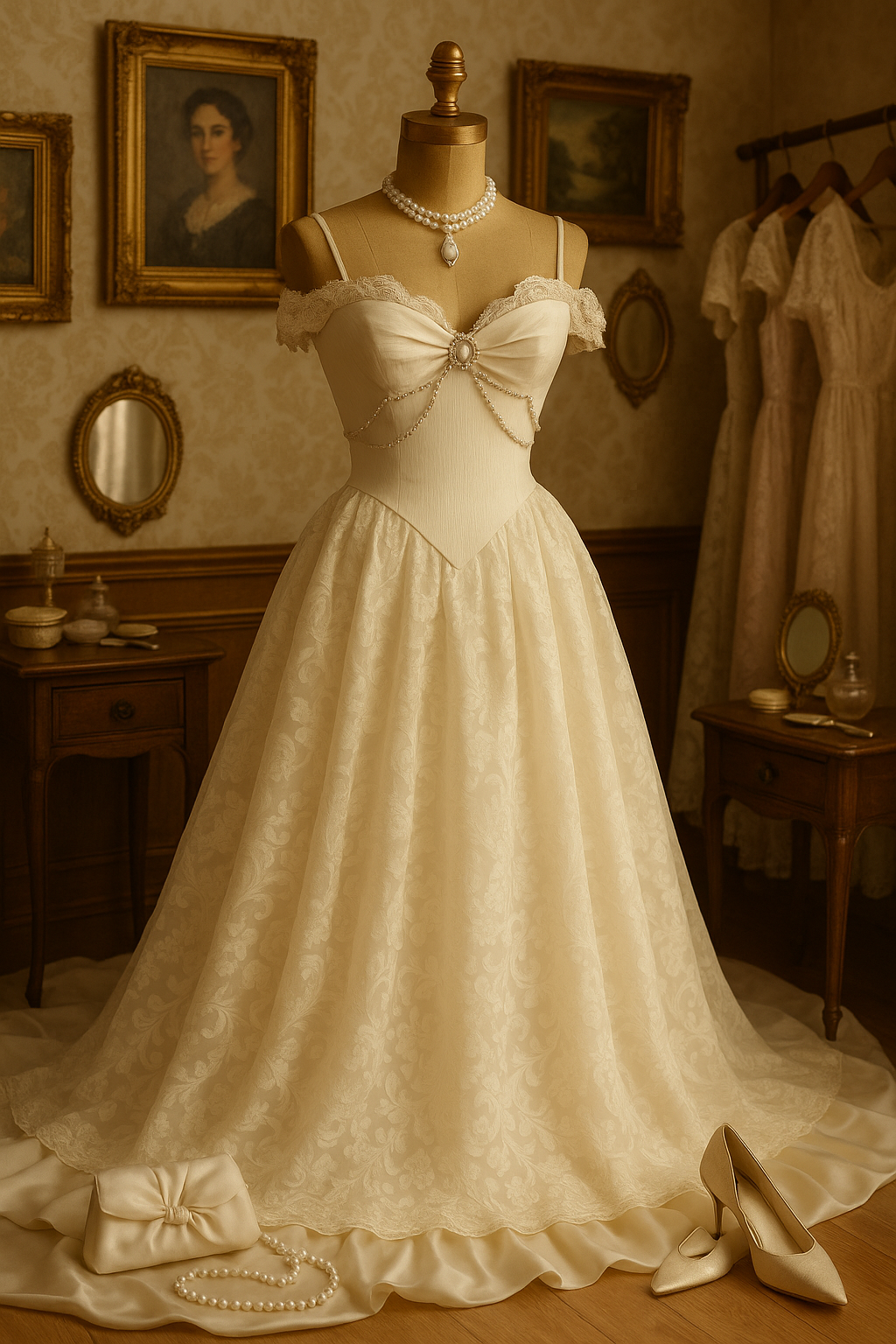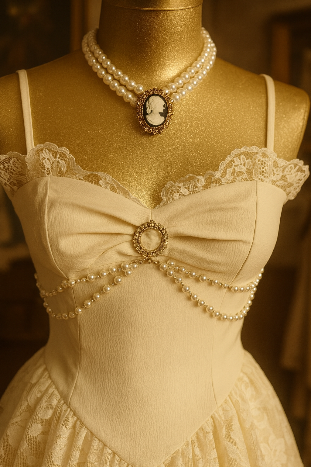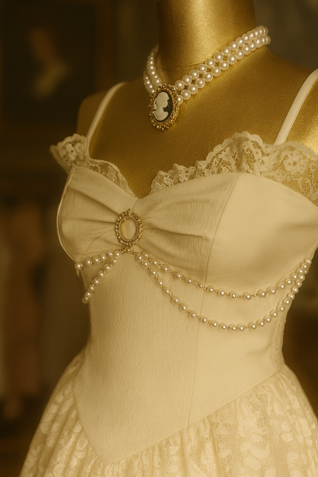 Kumaşlar: Dantel, saten, inci boncuk, metal broş