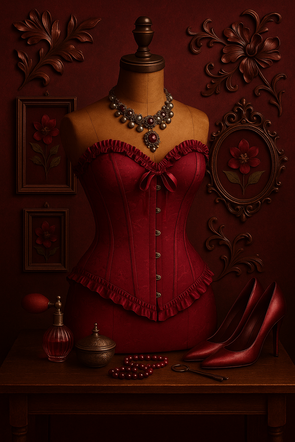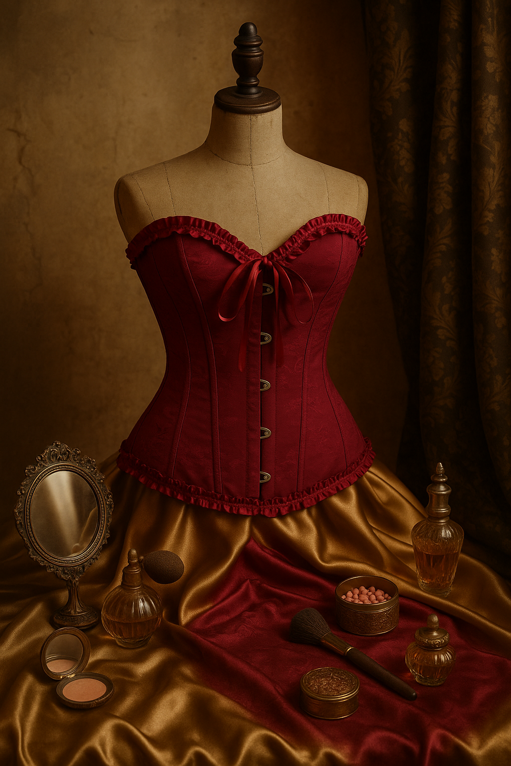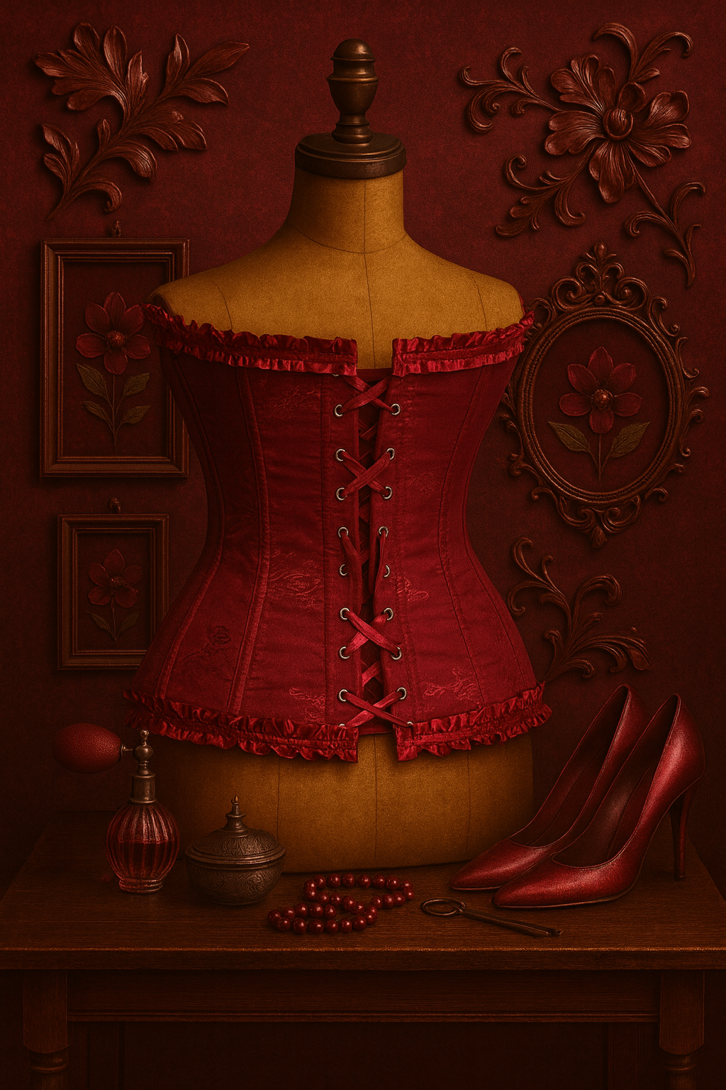 Yılbaşı gecesinde ışığın her kırmızı tonunda parlayan, güçlü ve feminen bir silüet… Vişne Gecesi Korse Büstiyer; burgonya kırmızısının sofistike havasını, vintage bir terzi atölyesinin zarafetiyle buluşturuyor.