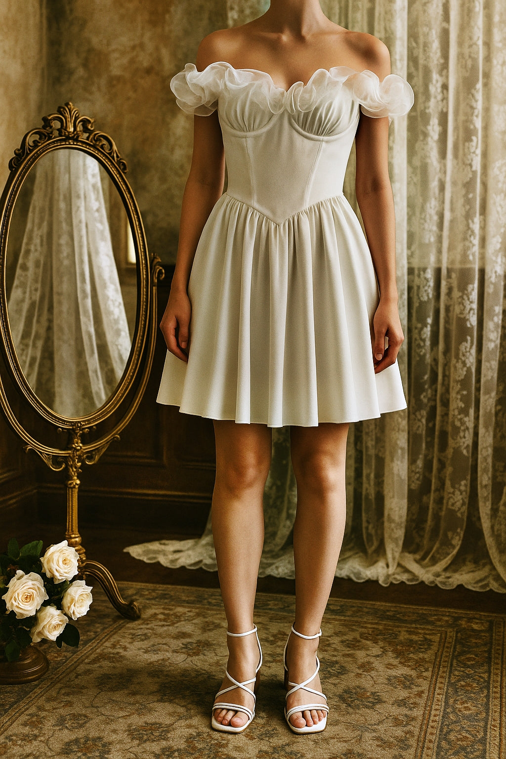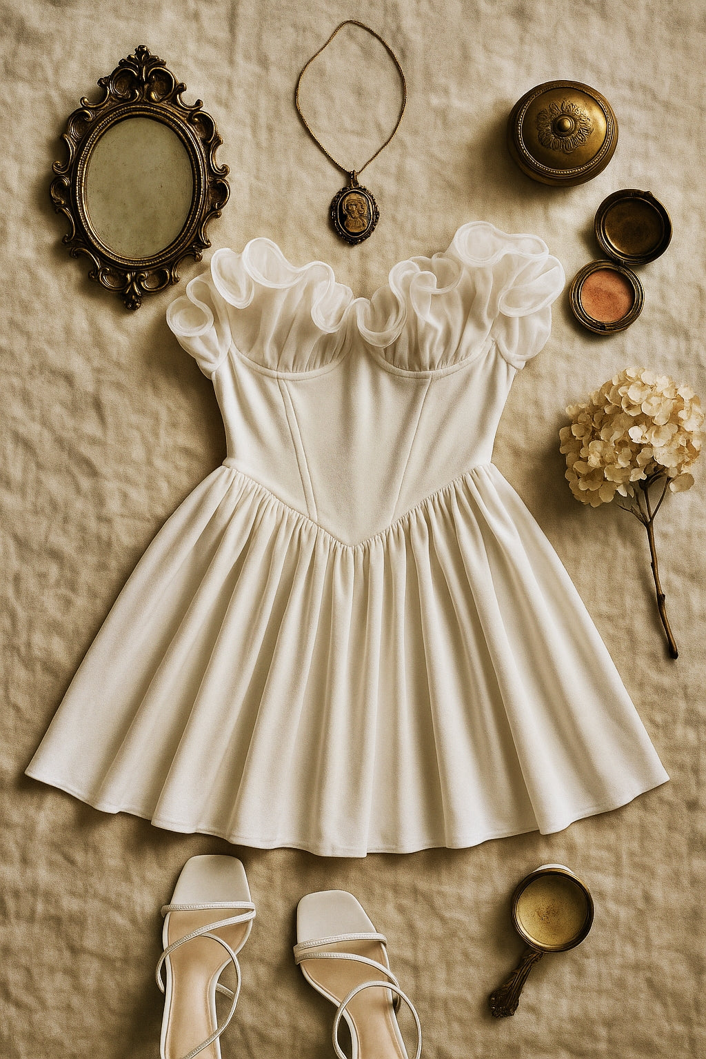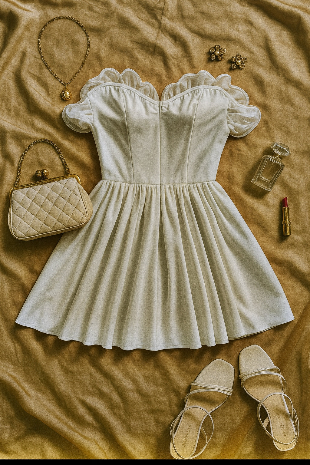 Whispers of Romance, aşkla işlenmiş beyaz tonları ve fırfırlı yaka detayıyla kalplerde iz bırakır. Romantizmin en sade halini taşıyan bu mini elbise, yumuşak dokulu örme kumaşı ve yüksek bel kesimiyle hem nostaljik bir silüet hem de çağdaş bir zarafet sunar.
