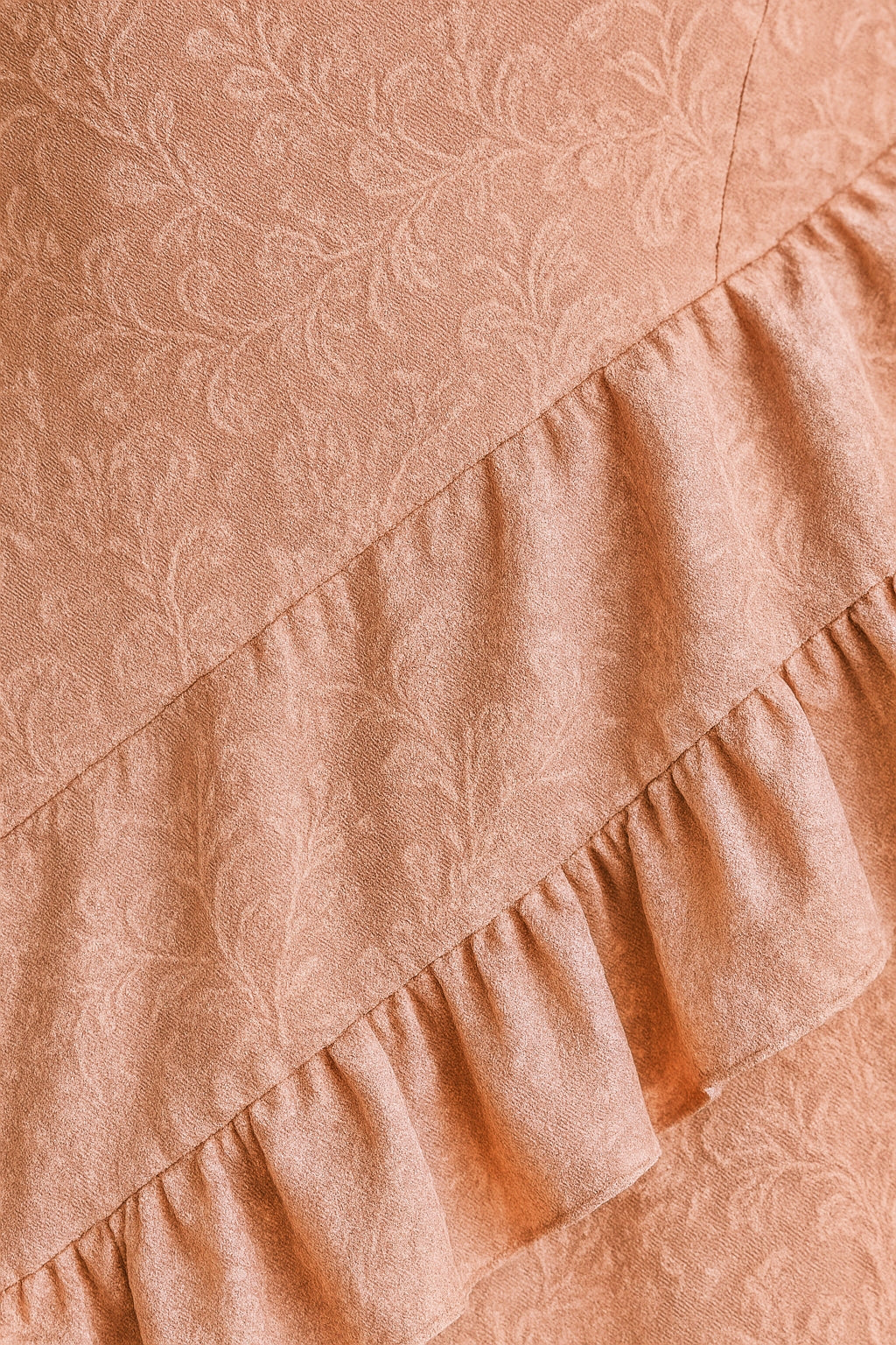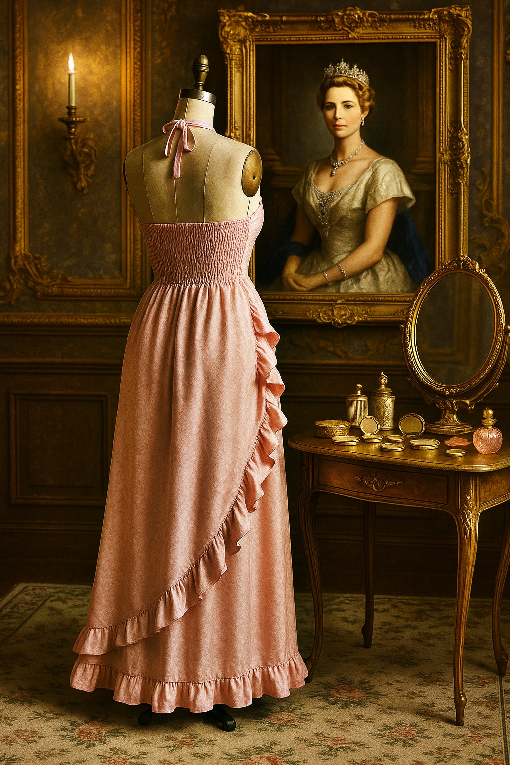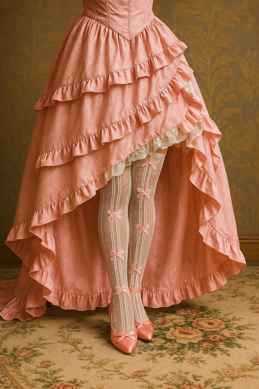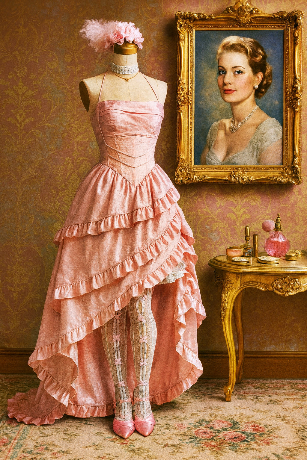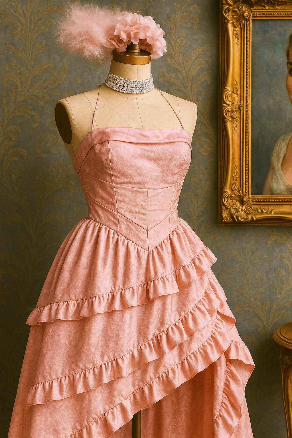 Fırfırlı katmanlarla zenginleştirilen etek kısmı, her adımda hafifçe dans edercesine hareket eder. Arka kısmı uzun, ön kısmı kısa tasarlanarak hem nostaljik hem de özgün bir siluet yaratılmıştır. Elbise, özel tasarım dantel çoraplar ve zarif pembe saten ayakkabılarla tamamlandığında, adeta bir saray portresinden çıkmış gibi görünür.