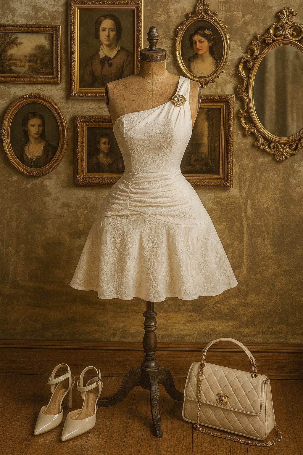 Zarafetin sembolü olan Camélia Dorée, altın kamelya broş detayı ve tek omuzlu siluetiyle adeta romantik bir tabloyu andırıyor. Yüksek bel kesimi, bedeni kusursuz şekilde sararken; kısa A kesim eteğiyle hem vintage hem de modern bir görünüm sunuyor.