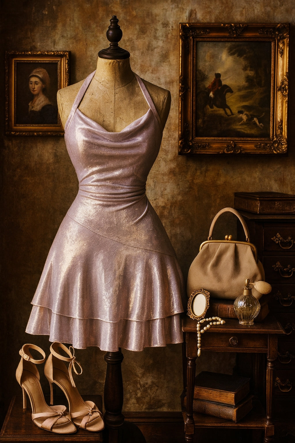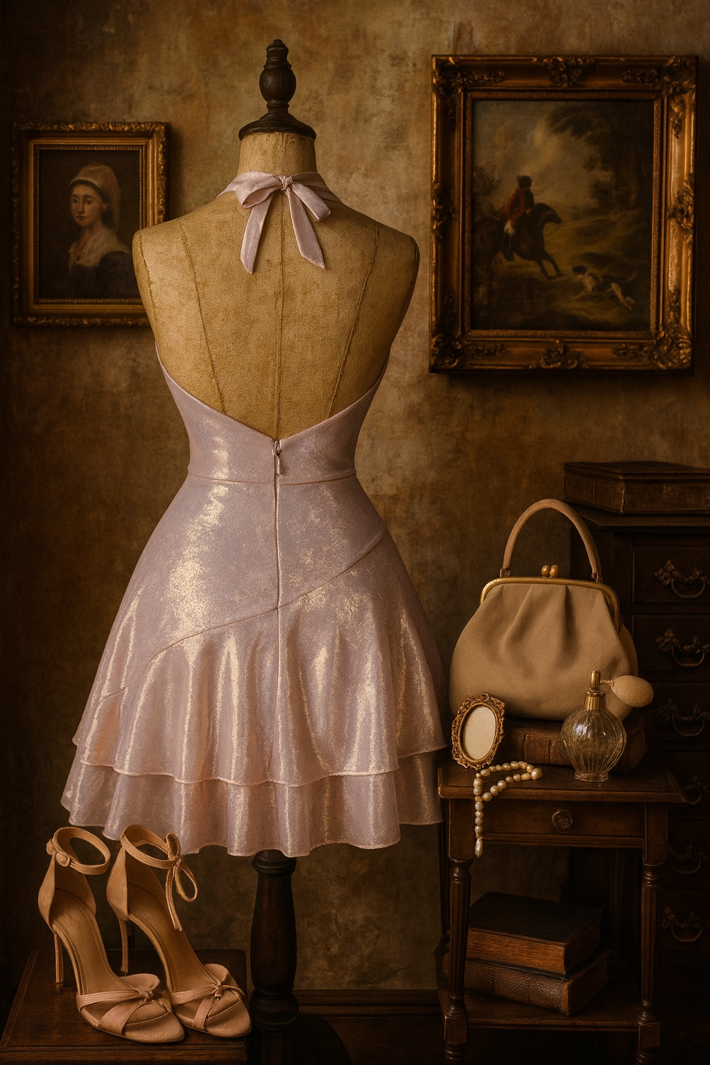 Vintage romantizmini modern zarafetle buluşturan Belle Nuit, ışıltılı saten görünümlü dokusuyla ışığın her tonunu yansıtır. Halter yaka detayı, zarif sırt dekoltesi ve katlı mini eteğiyle hem feminen hem de hareketli bir görünüm sunar. Mezuniyet, parti ve özel davetlerde göz kamaştırmak için ideal bir seçimdir.