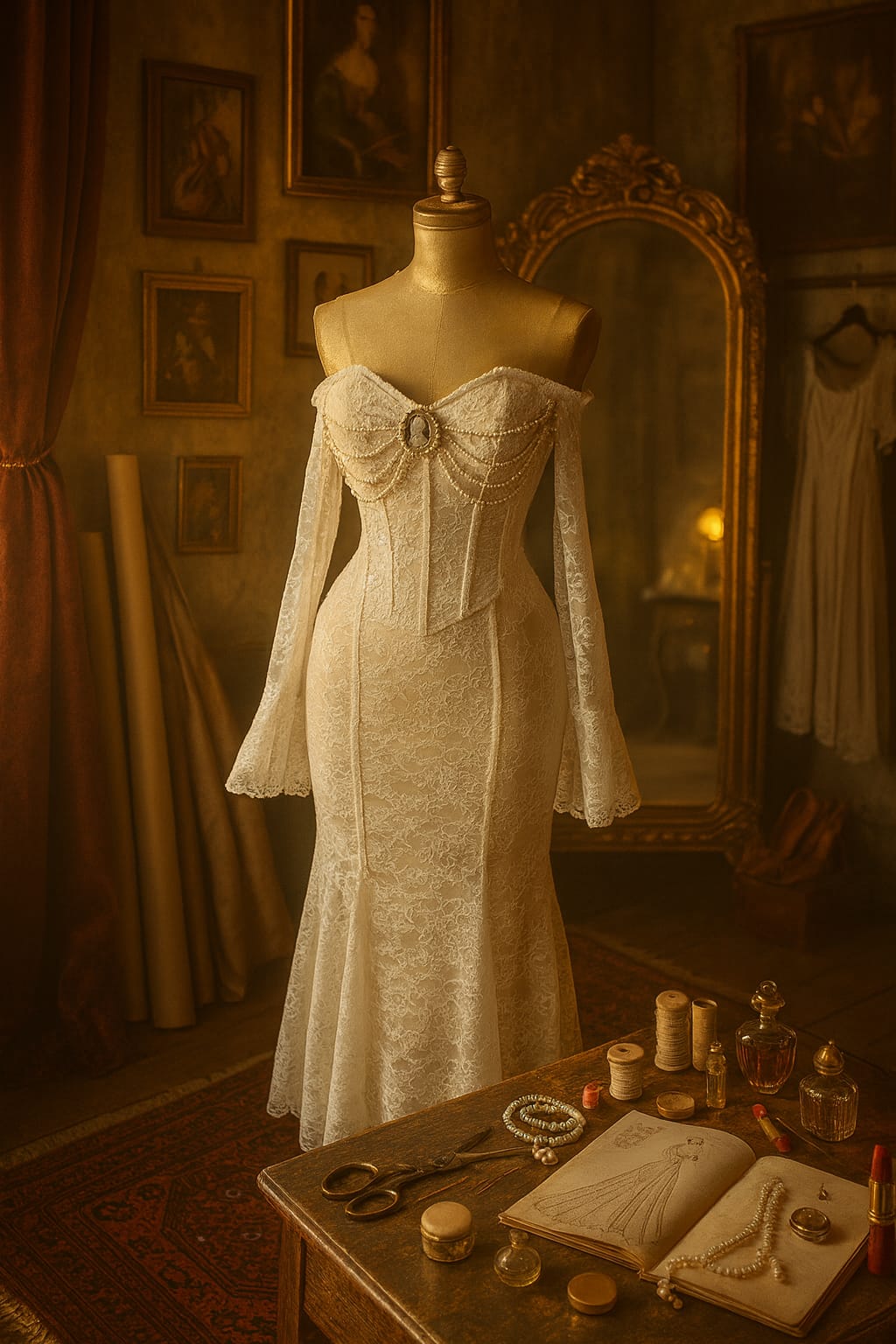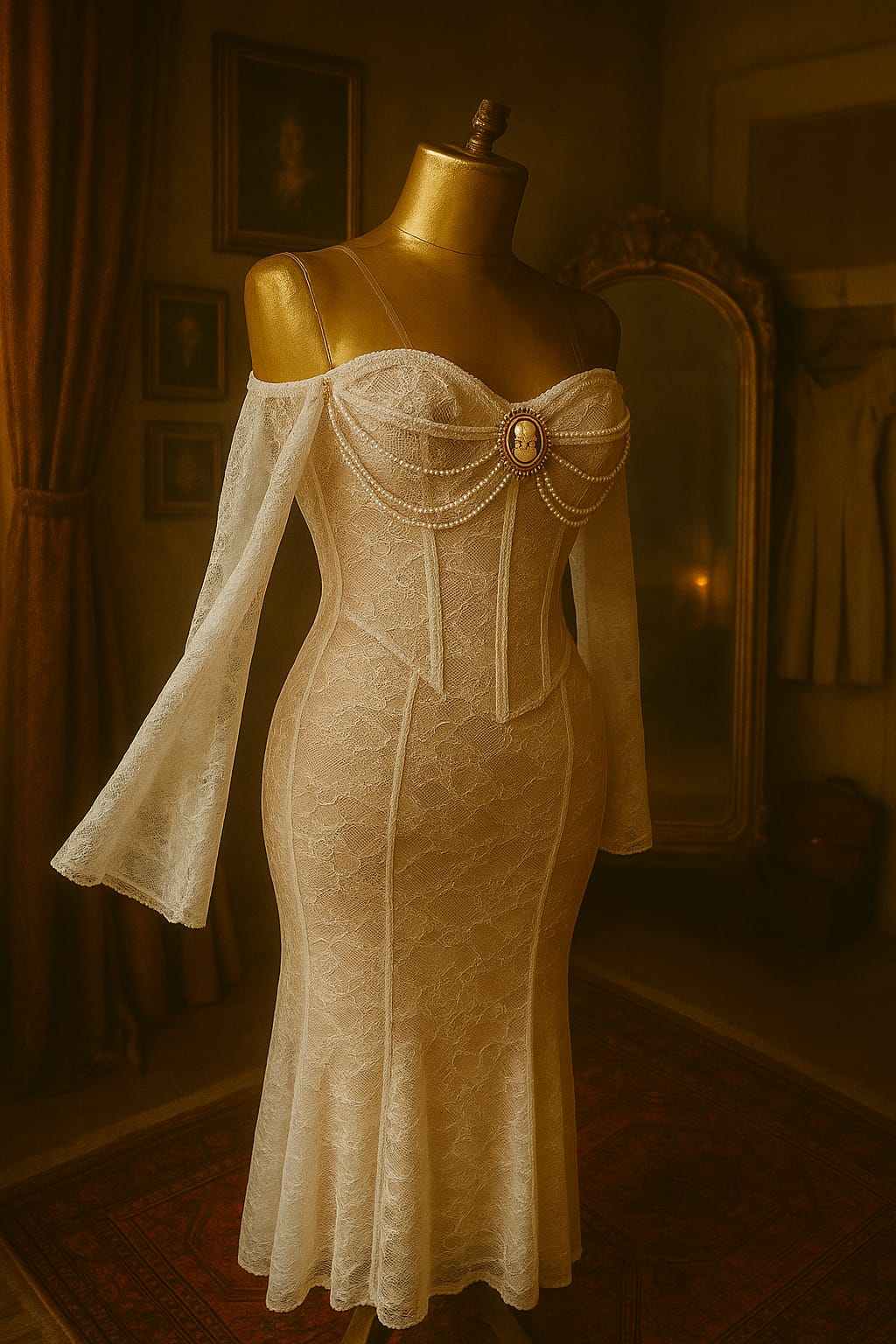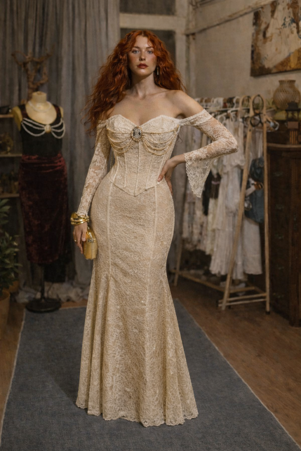 Zarafetin, romantizmin ve vintage ihtişamın vücut bulmuş hali: Dantelle Élégance, Aleida Koleksiyonu'nun en özel parçalarından biridir. Vücuda tam oturan korseli yapısı ve şampanya tonlarındaki ince danteliyle, adeta geçmiş yüzyıllardan günümüze taşınmış bir şiir gibidir. Göğüs kısmında yer alan klasik kameo broş ve inci işlemeler, bu elbiseyi özel anlar için vazgeçilmez kılar.