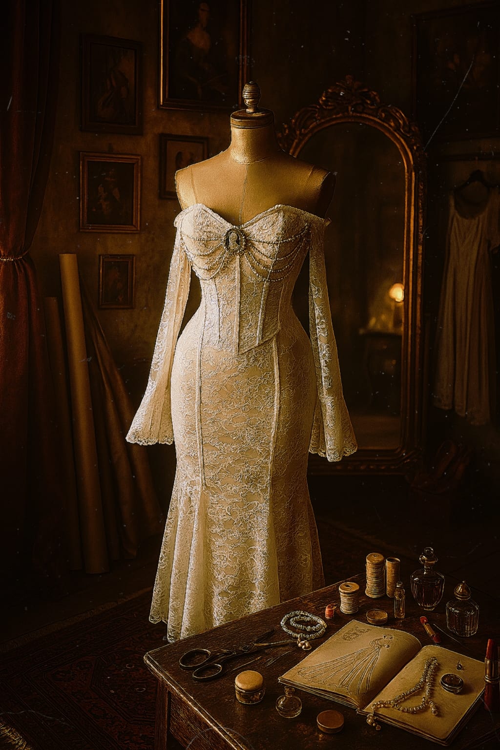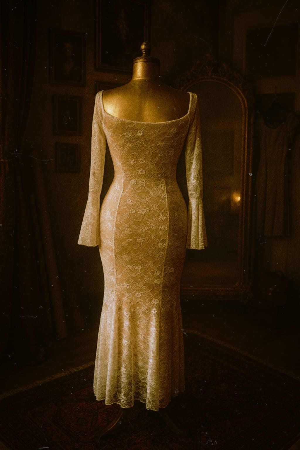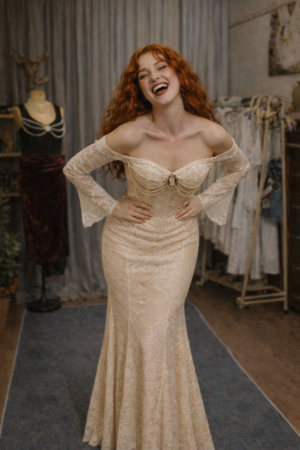 Zarafetin, romantizmin ve vintage ihtişamın vücut bulmuş hali: Dantelle Élégance, Aleida Koleksiyonu'nun en özel parçalarından biridir. Vücuda tam oturan korseli yapısı ve şampanya tonlarındaki ince danteliyle, adeta geçmiş yüzyıllardan günümüze taşınmış bir şiir gibidir. Göğüs kısmında yer alan klasik kameo broş ve inci işlemeler, bu elbiseyi özel anlar için vazgeçilmez kılar.