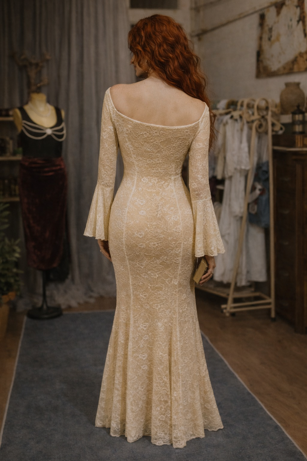 Her detayı özenle tasarlanan bu elbise; çan kol yapısı, Madonna yaka formu ve deniz kızı siluetiyle zarafetin tanımını yeniden yazıyor.
