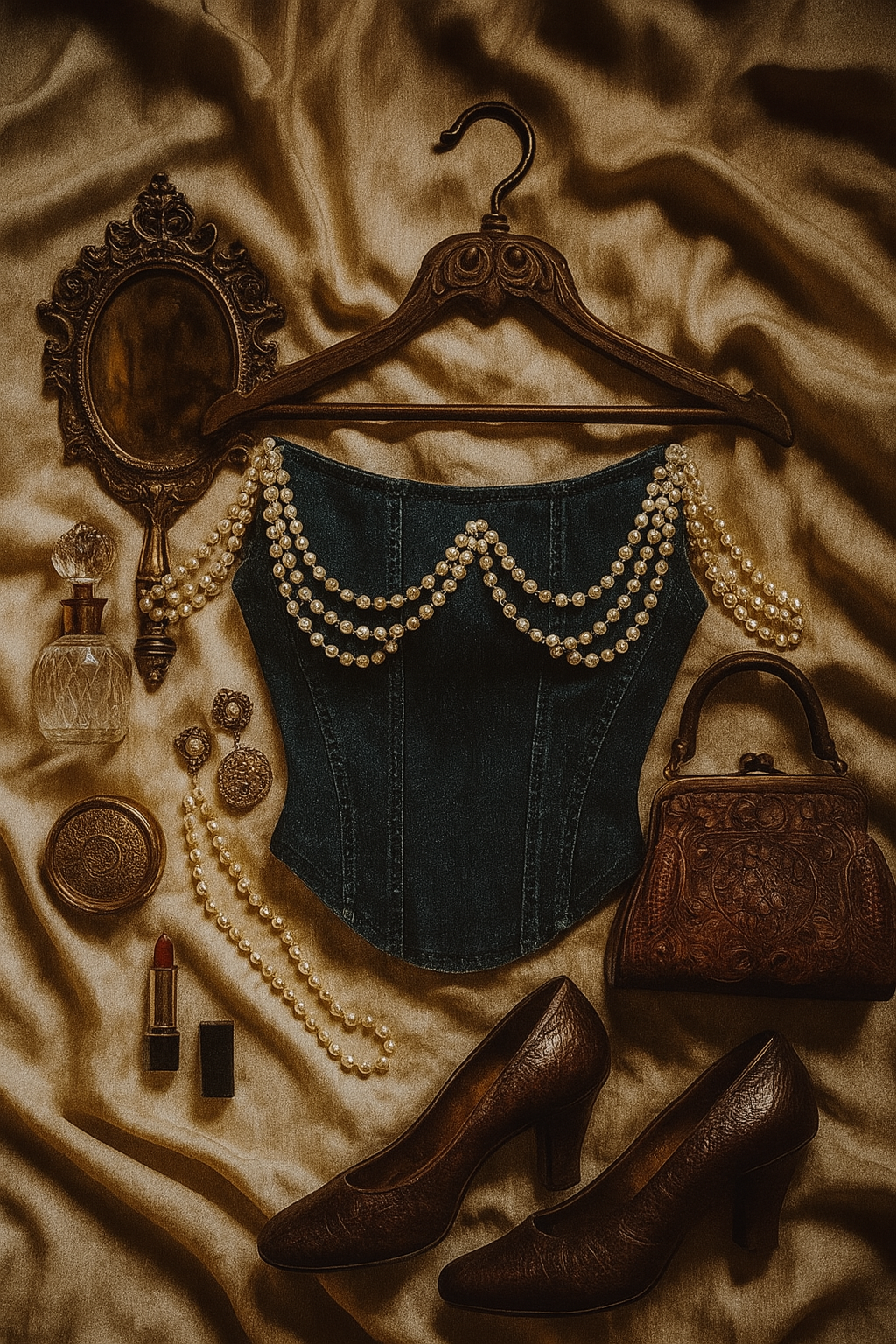 Vintage estetiği modern şıklıkla buluşturan bu kot korse, omuzdan düşen inci zincir detaylarıyla göz alıcı bir duruş sergiler. Bel hattını vurgulayan mikro crop kesimiyle, hem romantik hem de iddialı bir siluet sunar. Arka kısmında yer alan fermuarla kolay giyilip çıkarılır. İnci detayları özel günlerde şıklığınızı tamamlayacak, denim dokusu ise gün boyu rahatlık sunacaktır.