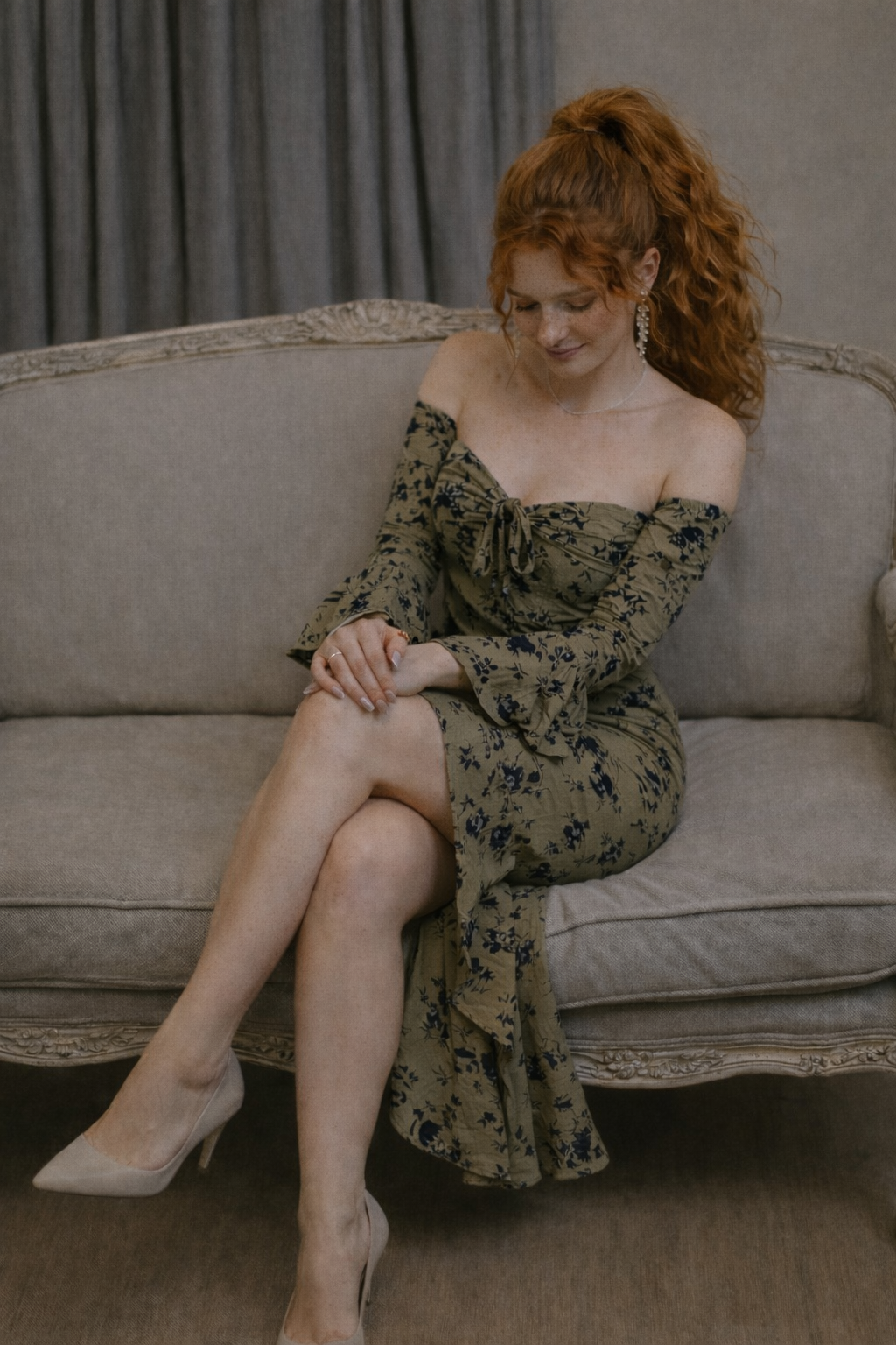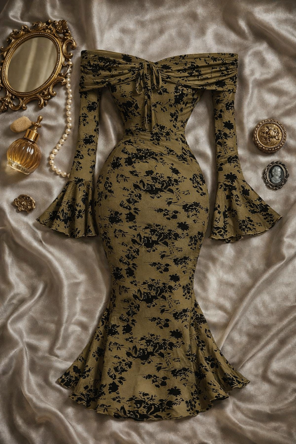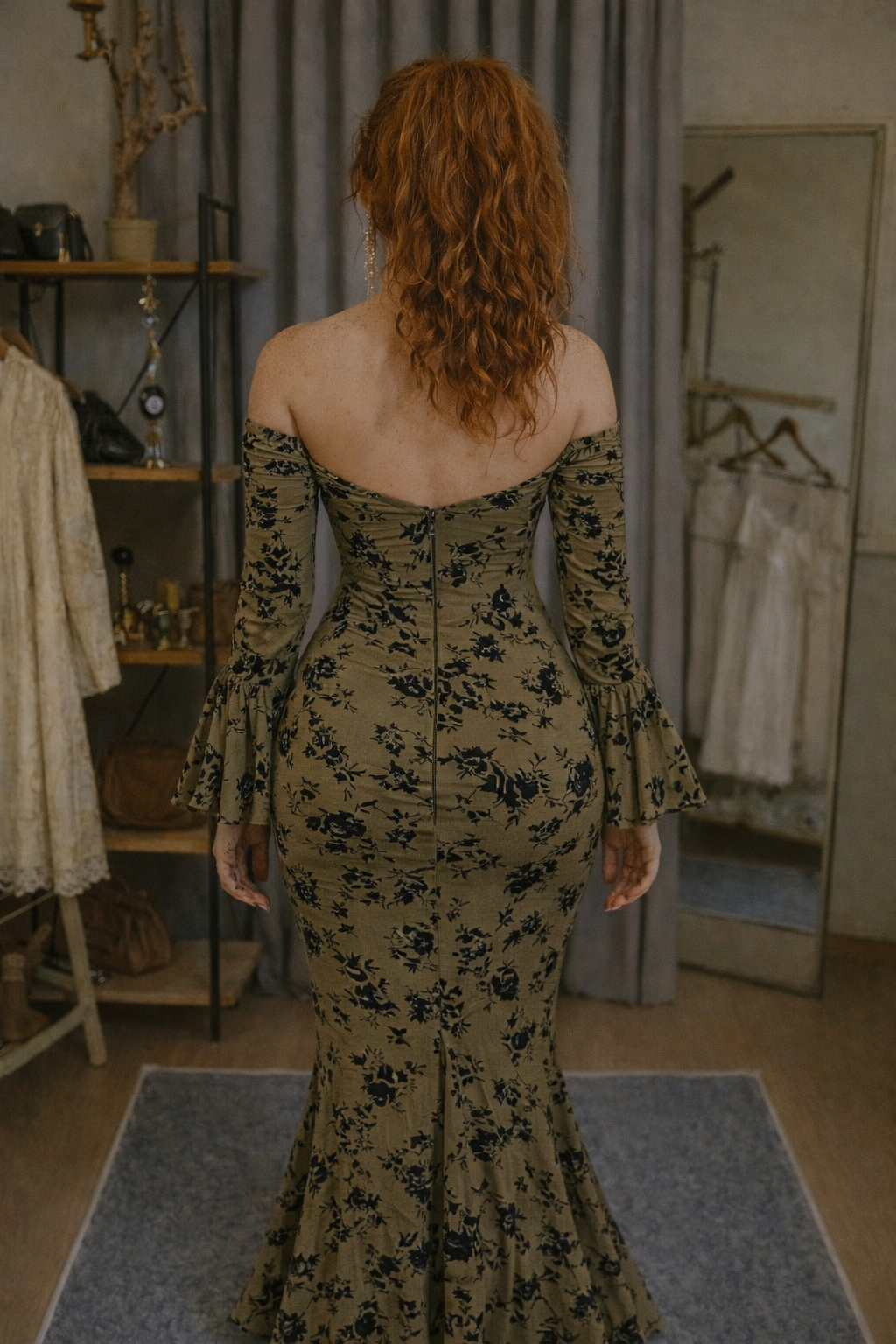 Omuzları açık, zarif drapeli üst formu; bele oturan korsaj yapısıyla feminen silueti vurgularken, balık kesime doğru açılan eteği elbiseye akışkan ve asil bir duruş kazandırır.