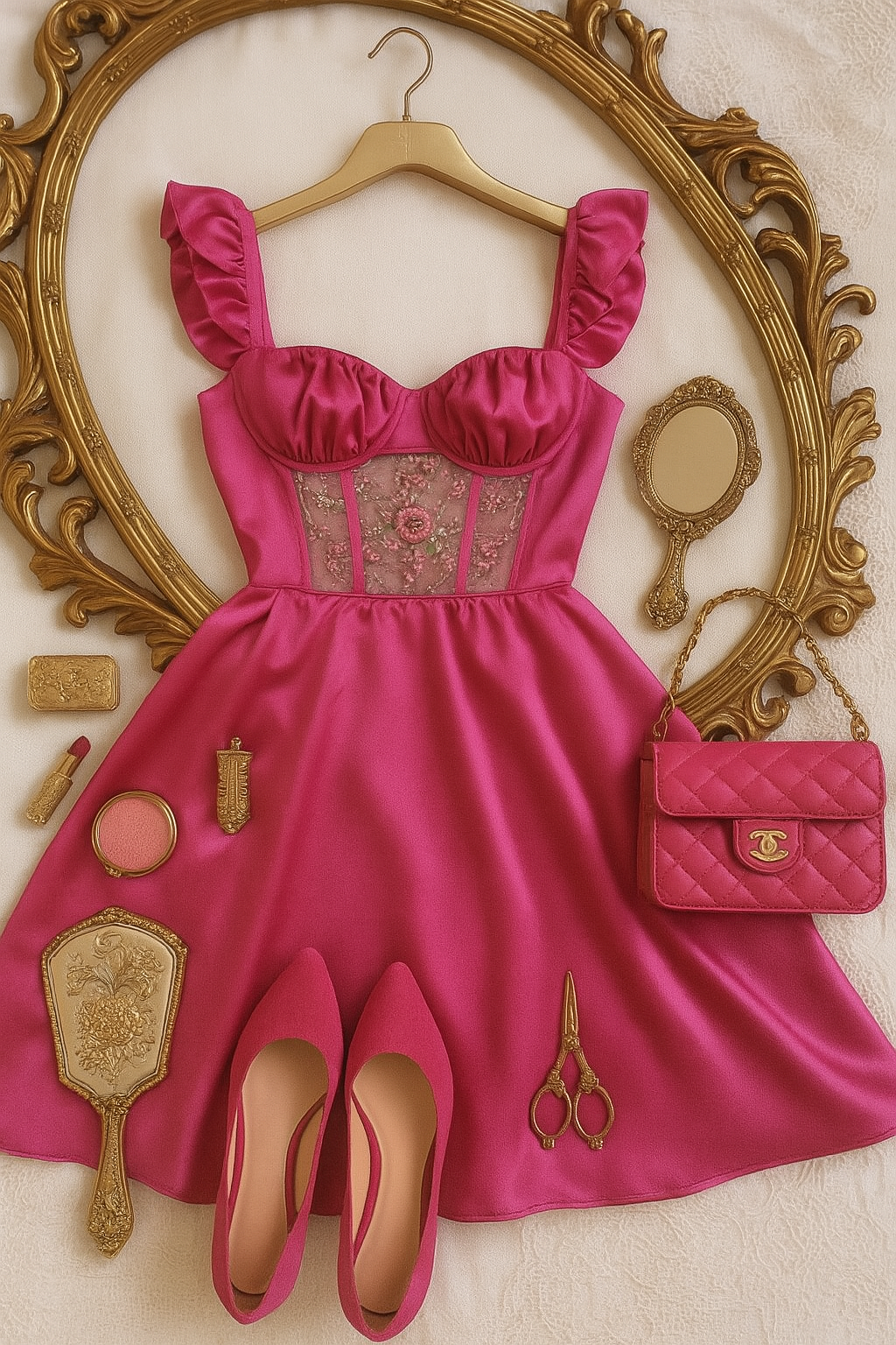 Elbise Aleida Atölyesi'nde sınırlı sayıda üretilmiş olup; iç kısmı astarlıdır ve vücuda oturan formuyla özel günlerde sizi bir yıldız gibi hissettirir. Vintage altın ayna, ruj, pudra ve Chanel esintili çanta gibi aksesuarlarla kombinlendiğinde ortaya çıkan görüntü adeta bir dönem filmi sahnesini andırır.