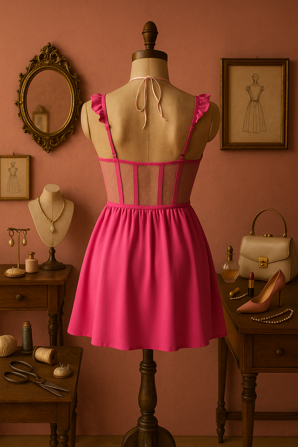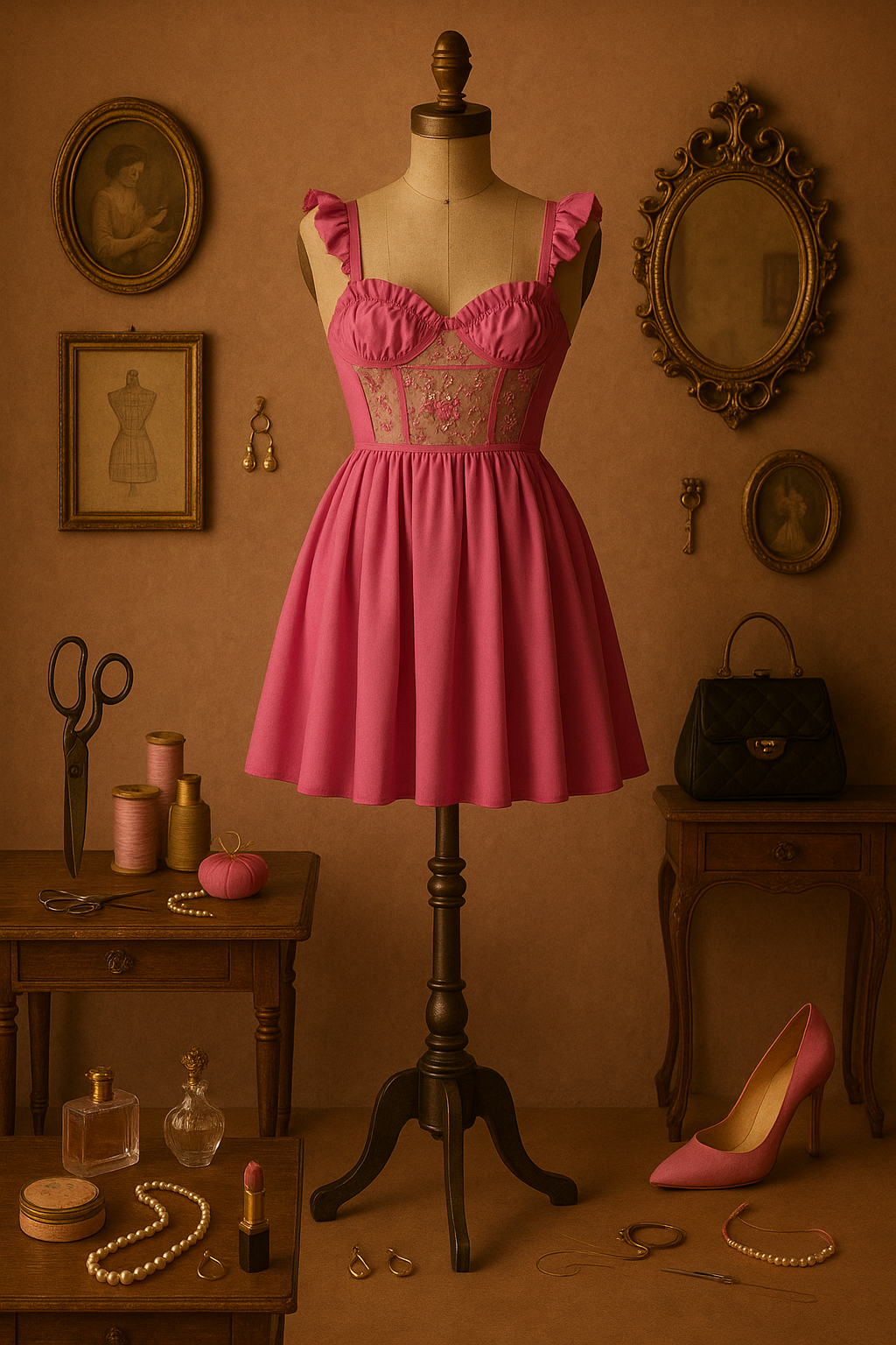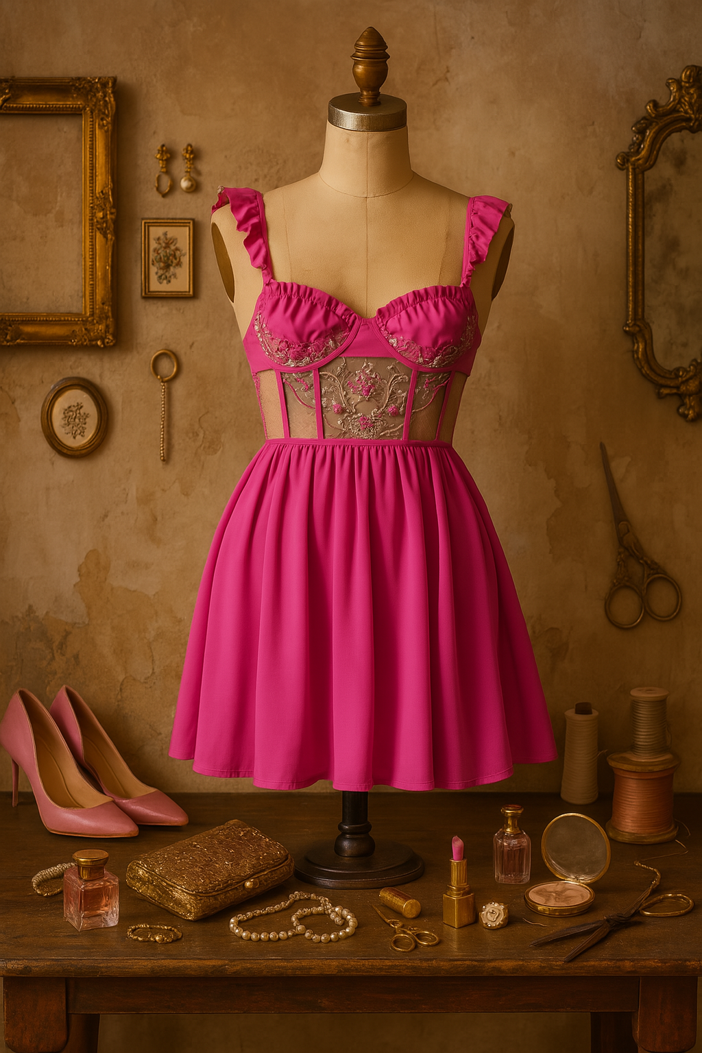Fuchsia Grace, fuşya satenin göz alıcı ışıltısı ve zarif işlemeli transparan korse detayıyla, romantizmi cesaretle buluşturuyor. Göğüs kısmındaki fırfırlı askılar ve zarif dikiş geçişleri, feminen siluetinizi vurgularken, el işçiliği çiçek motifli tül detayları elbiseye nostaljik bir ihtişam katıyor.