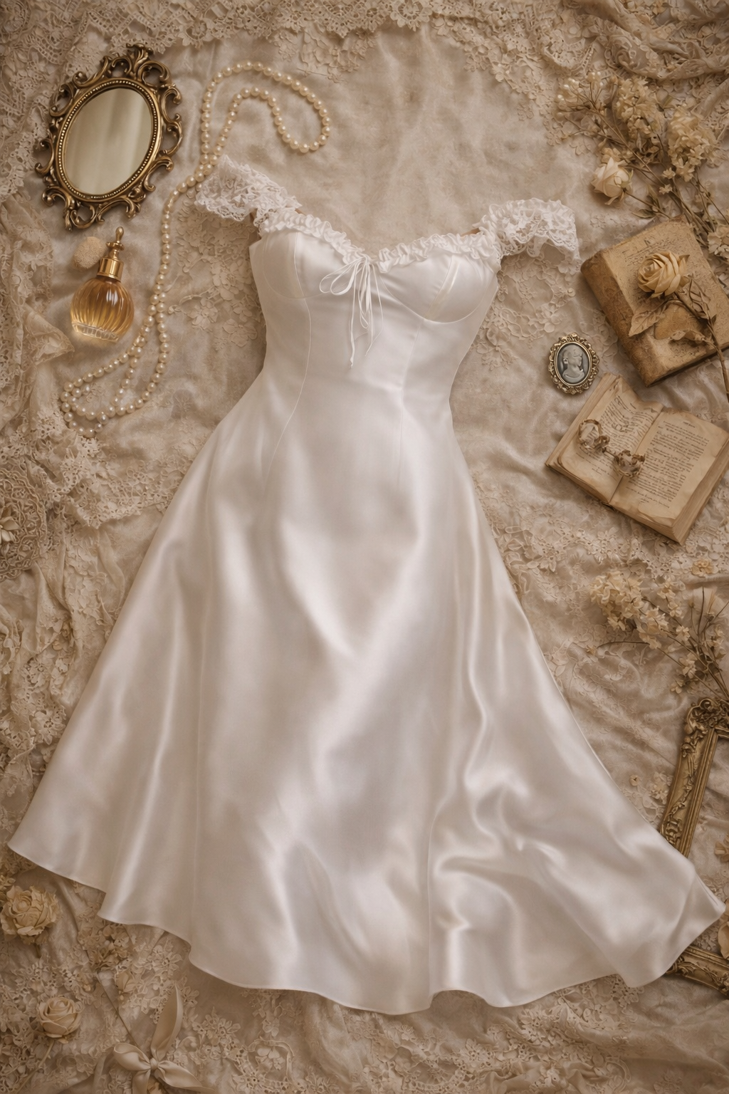 Doğal formu bedeni nazikçe sararken; dantel detayları ve akışkan etek yapısı, hareket halinde feminen ve hafif bir siluet oluşturur.