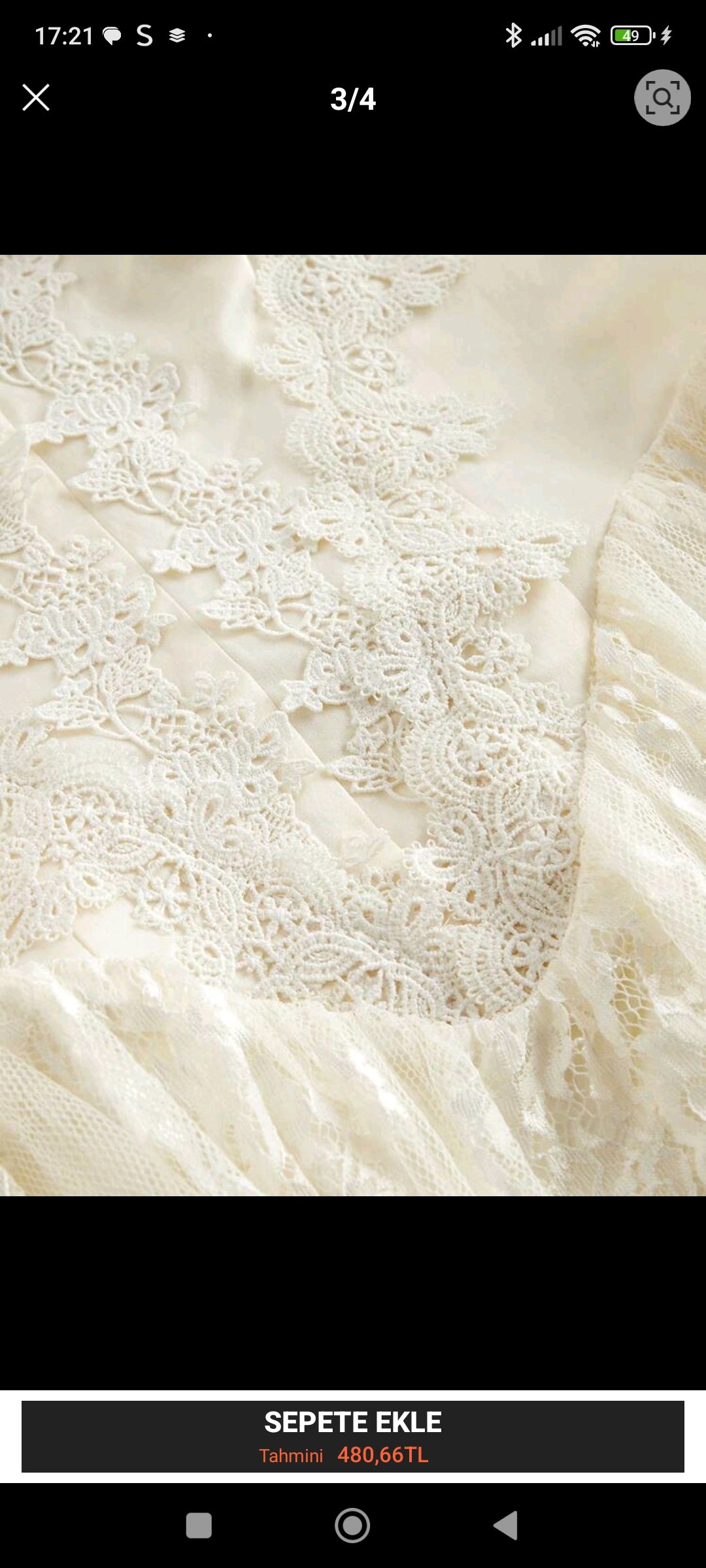 > Elbisenin tamamı yumuşak dokulu, çiçek motifli zarif dantelden üretilmiştir. İç kısmında cildi tahriş etmeyen, kaygan ve ipeksi bir saten astar yer almakta olup elbisenin formunu kusursuzca taşır.