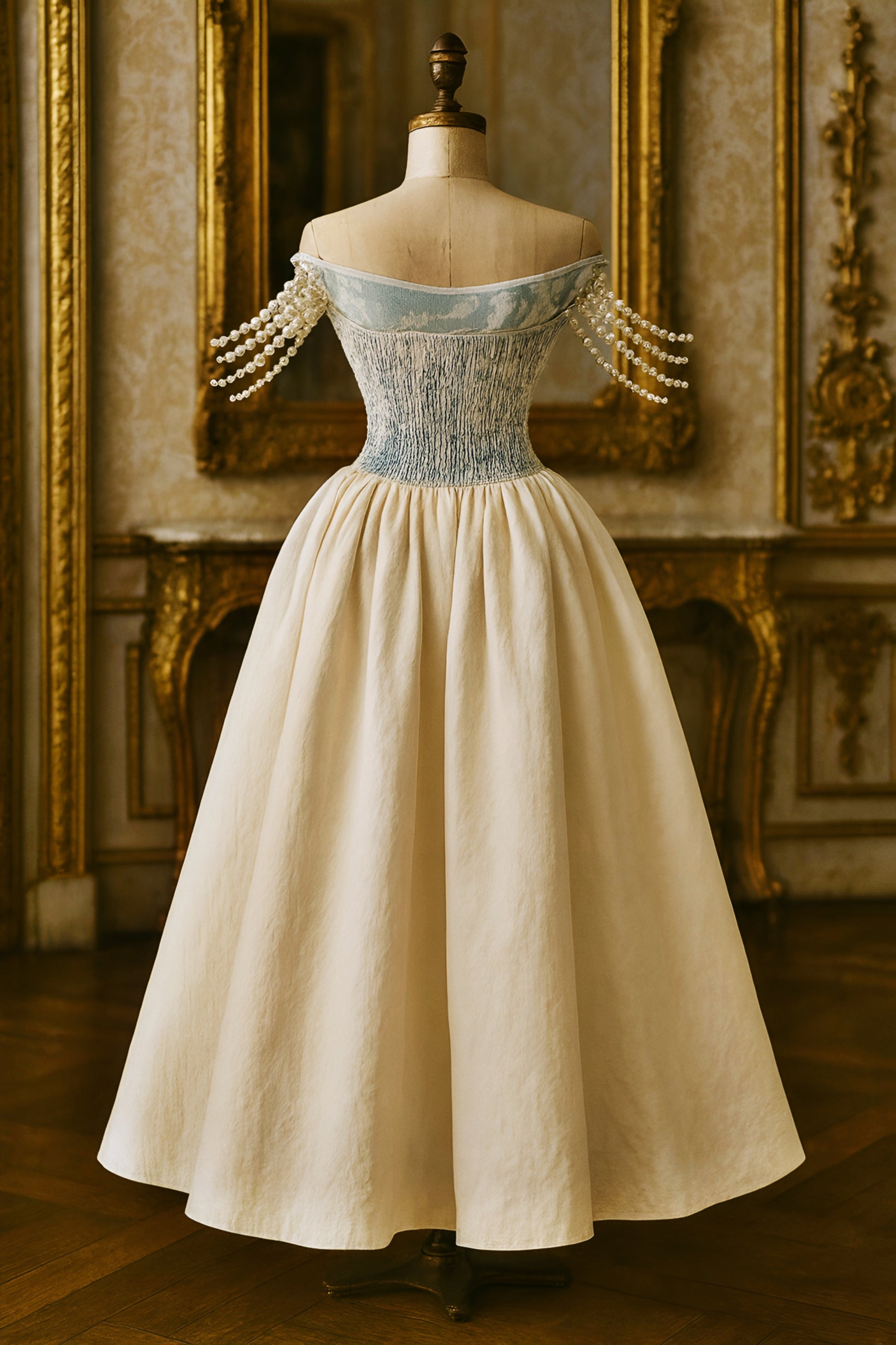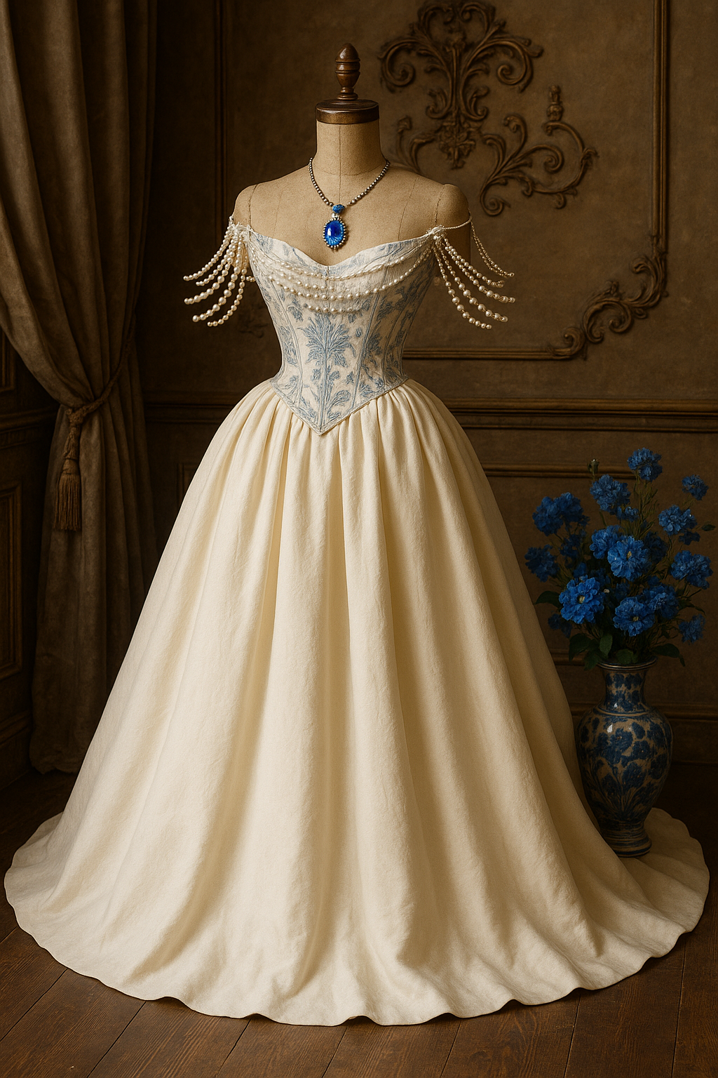 Baroque ve Rococo dönemlerinden ilham alan bu prenses formundaki elbise, zarif ve sade bir şıklık sunar. Gövde kısmı, gri-mavi tonlarda dokulu korse ile şekillendirilmiş olup vücudu nazikçe toparlar. Kabarık etek, dökümlü yapısıyla klasik bir prenses silueti oluşturur. Omuzlardan dökülen inci süslemeler, tasarıma feminen ve dönemsel bir dokunuş katar.