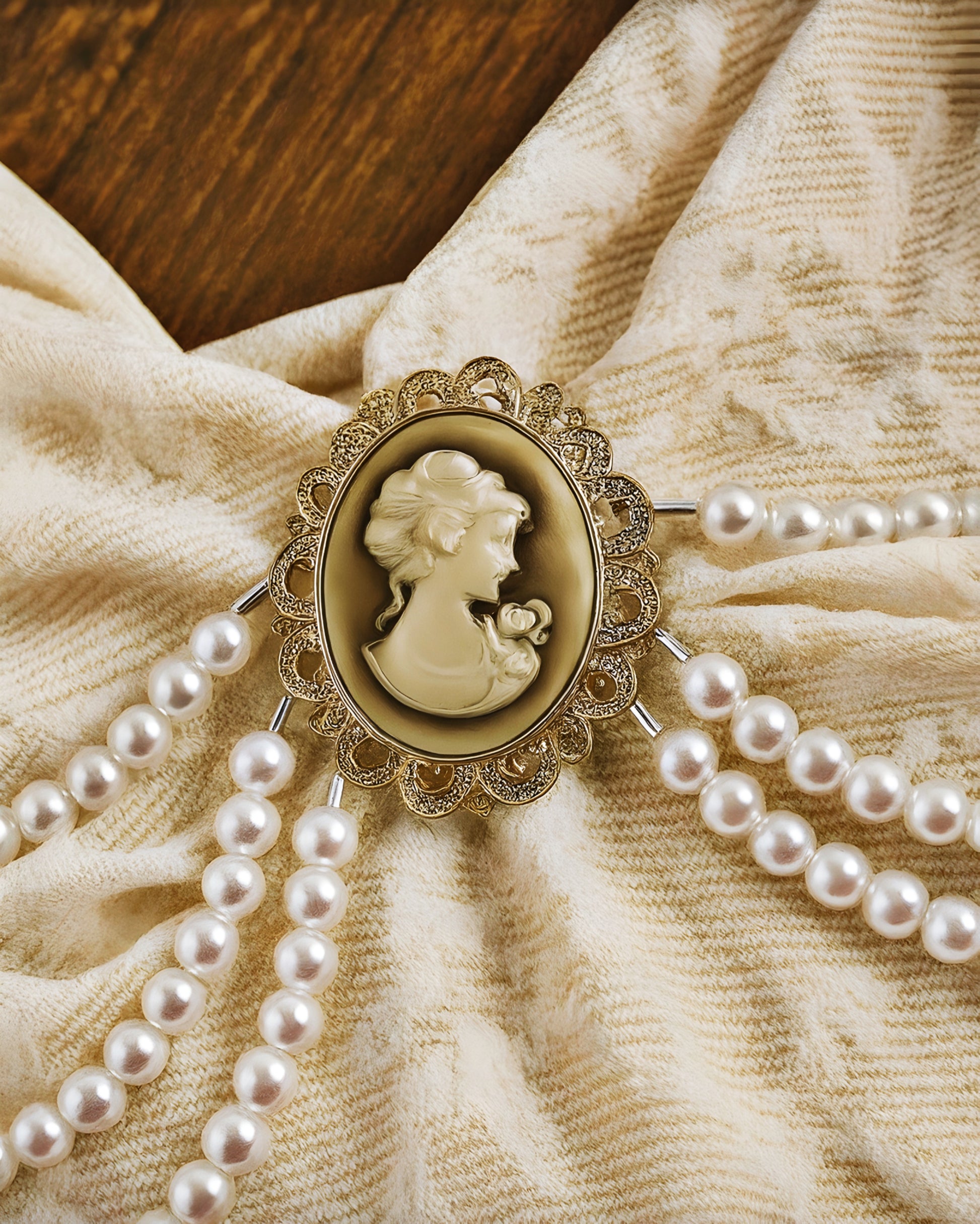 Kumaşında kullanılan özel dantel dokular, ince dokuma teknikleri ve barok döneme özgü kıvrımlı hatlar, elbiseye hem asil bir duruş hem de nostaljik bir ruh kazandırmaktadır. Ön kısmındaki çapraz yaka detayı ve beldeki broşla sabitlenen drape formlar, dönemin saray ihtişamını yeniden yorumlamaktadır. Arkadan zarif bir kurdeleyle bağlanan yaka ve ince yırtmaç detayı ise tasarıma modern bir nefes katmaktadır.