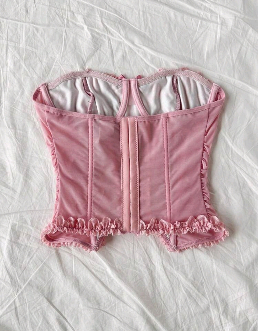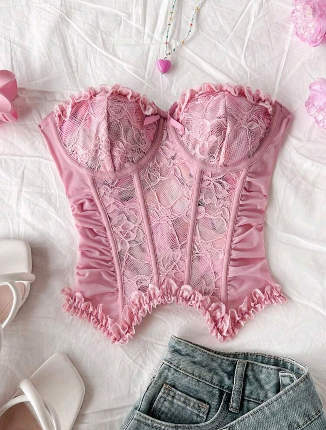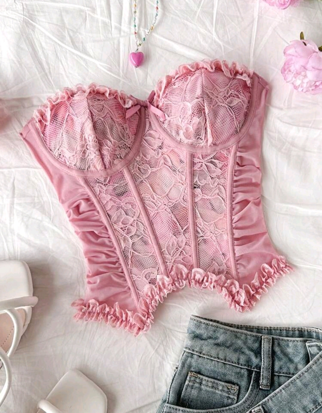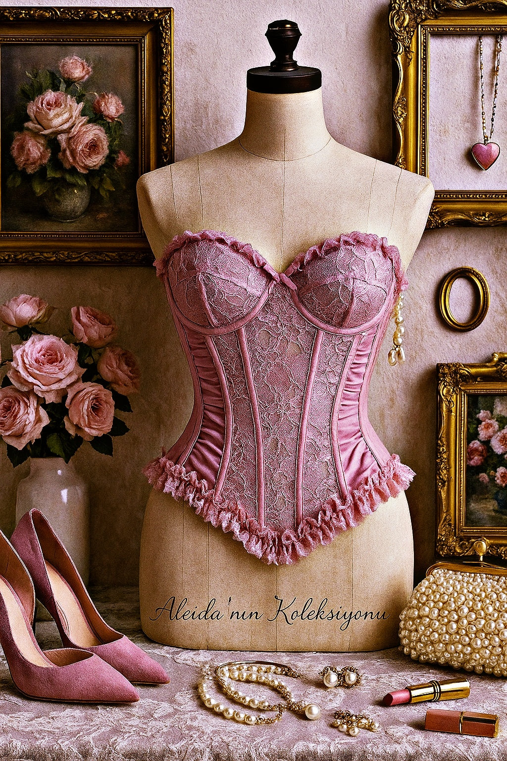 Romantik zarafetin yeniden yorumlandığı bu özel parça, dantel ve satenin büyüleyici uyumunu üzerinizde hissettirir. Pudra pembe tonlarındaki Rosalie büstiyer, volan detaylı etek ucu ve göğüs kısmındaki zarif fırfırlarla tam anlamıyla feminen bir siluet sunar.