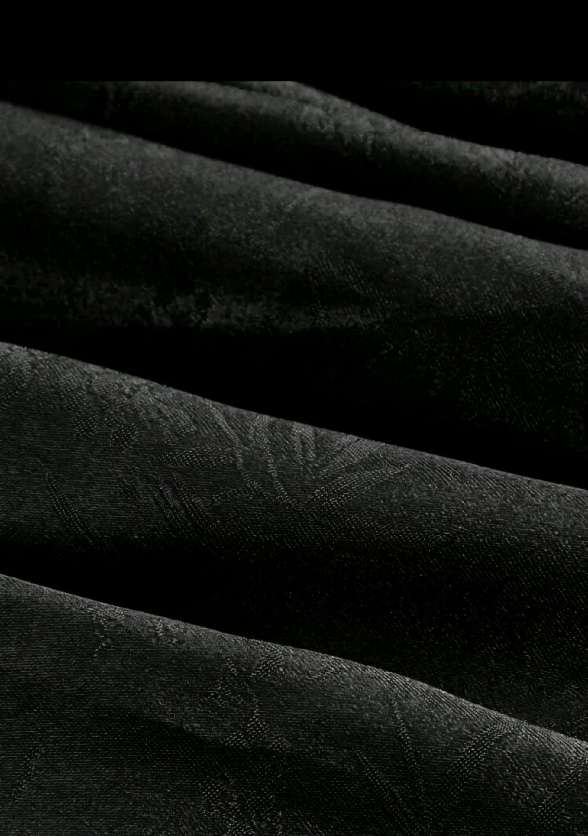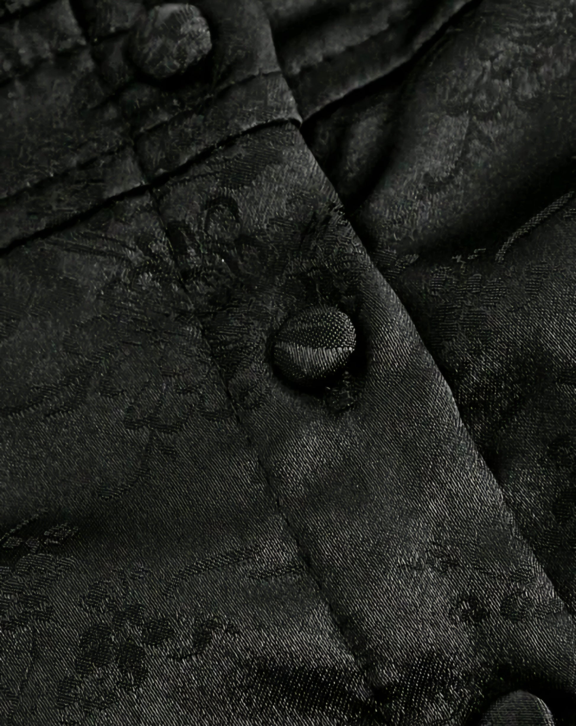 Barok desenli dokusuyla göz kamaştıran bu özel mini elbise, zarif dantel üst kısmı ve korsajlı formuyla nostaljiyi yeniden tanımlıyor. Hafif çan etek kesimi, bedenin inceliğini vurgularken hareket özgürlüğü sunar. İnce askıları ve düğmeli göğüs detayı elbiseye romantik ve sofistike bir dokunuş katar.