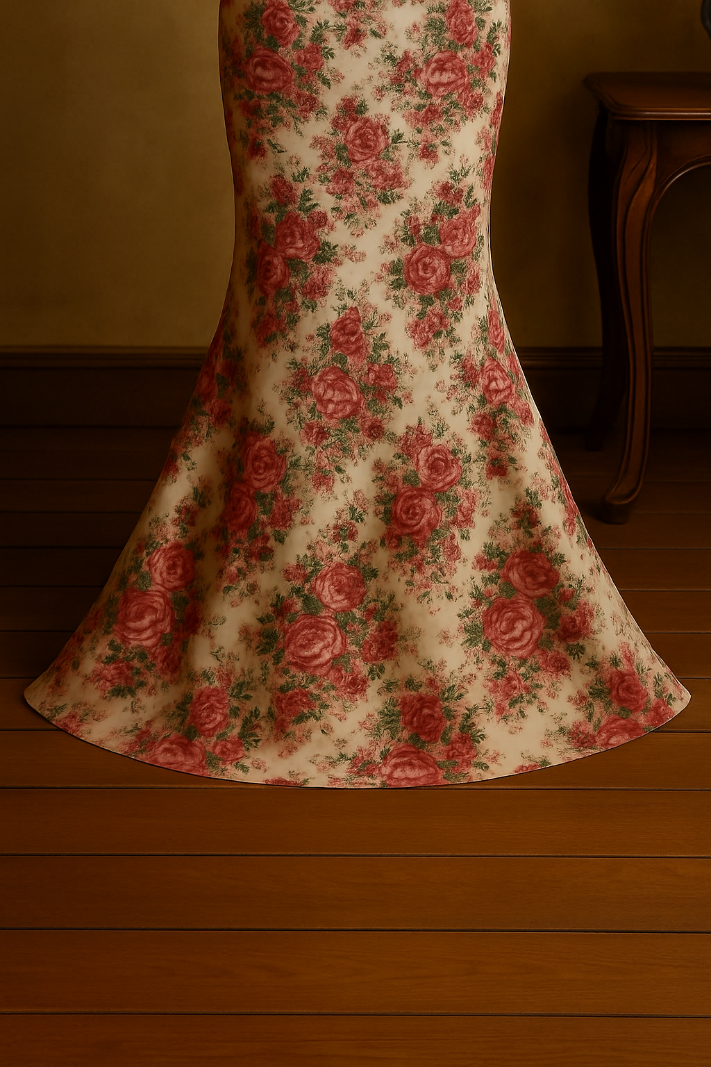 Arka bölümdeki zarif yırtmaç detayı, hareket özgürlüğü sağlarken aynı zamanda sofistike bir çekicilik katar. Kumaşın dokusu, dokunulduğunda hissedilen lüksü ve göz alıcı romantizmi bir araya getirir. Gül motifleri ise Van Gogh’un çiçek tablolarındaki canlılık ve natüralist zarafetle kıyaslanabilecek kadar sanatsaldır.