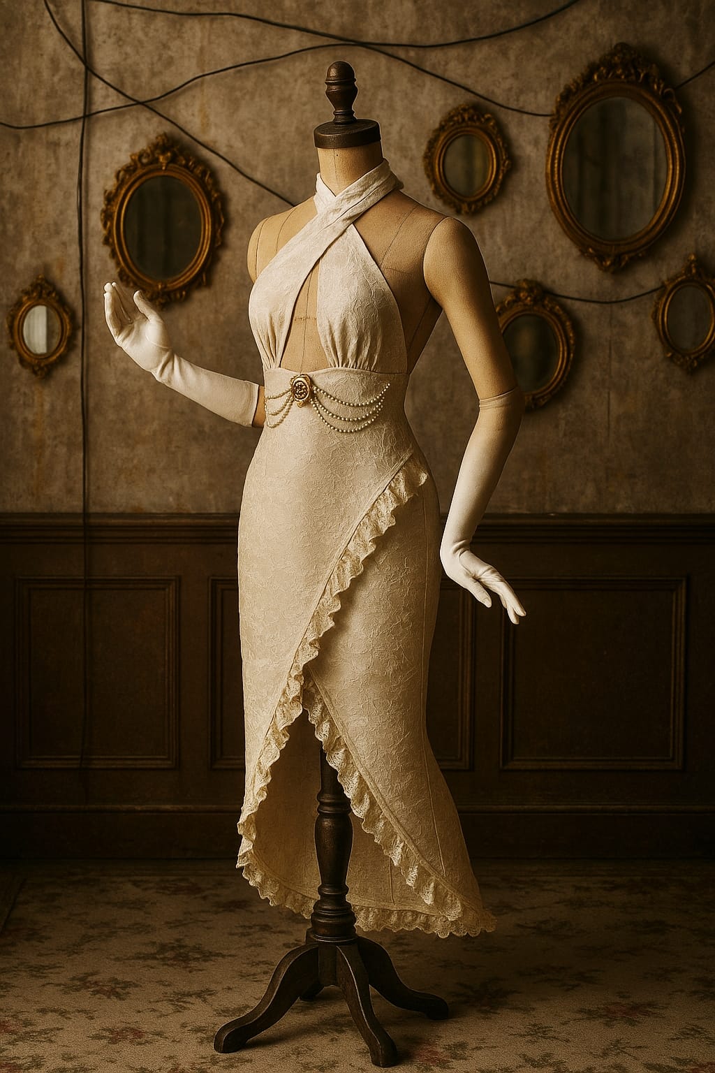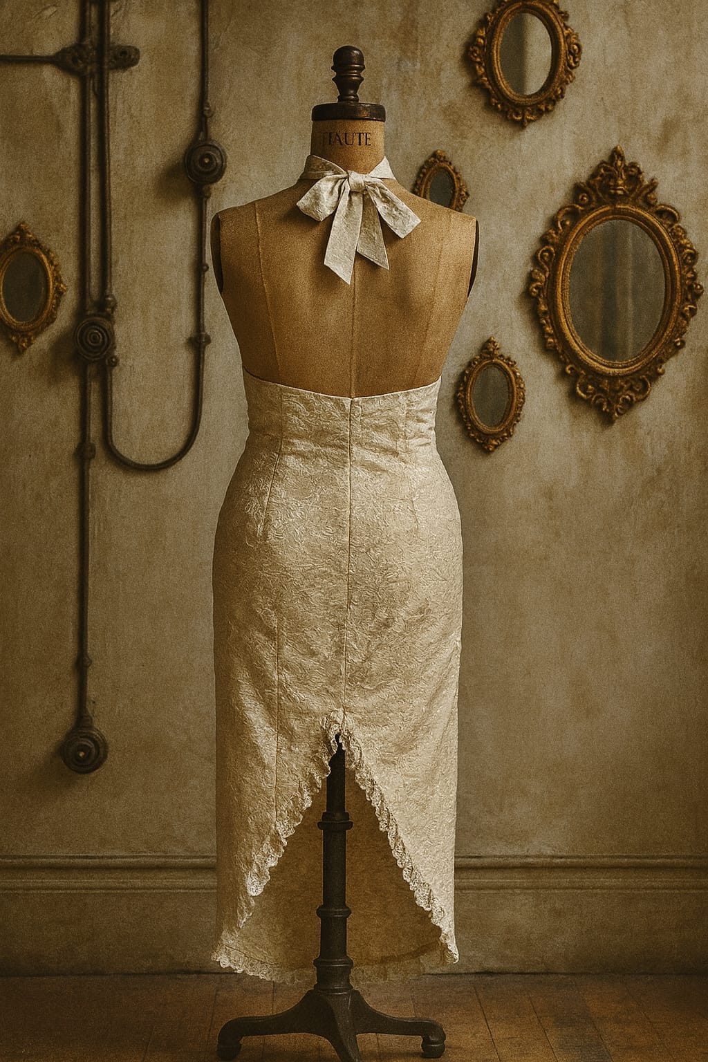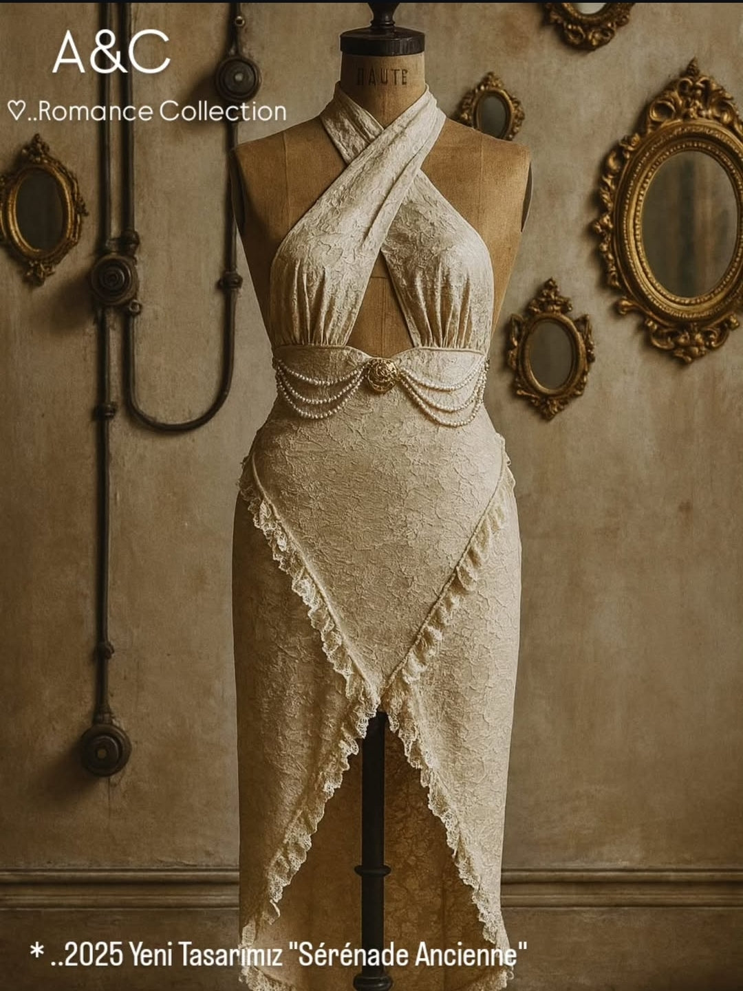 Kumaşında kullanılan özel dantel dokular, ince dokuma teknikleri ve barok döneme özgü kıvrımlı hatlar, elbiseye hem asil bir duruş hem de nostaljik bir ruh kazandırmaktadır. Ön kısmındaki çapraz yaka detayı ve beldeki broşla sabitlenen drape formlar, dönemin saray ihtişamını yeniden yorumlamaktadır. Arkadan zarif bir kurdeleyle bağlanan yaka ve ince yırtmaç detayı ise tasarıma modern bir nefes katmaktadır.